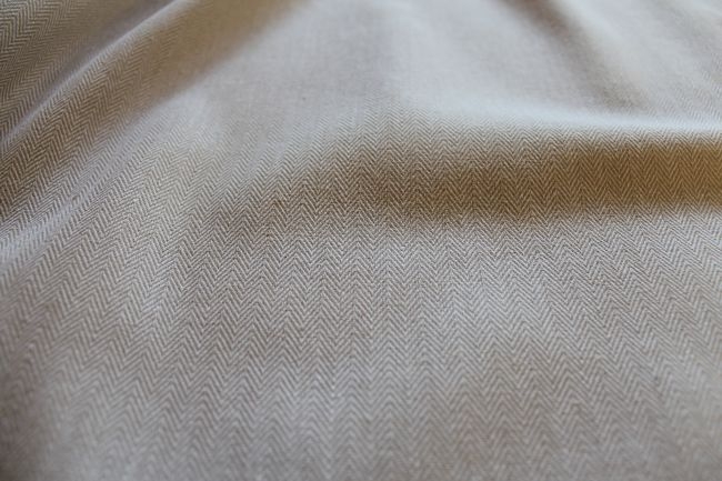 Dieser Fischgrat-Stoff ist aus zwei verschiedenen Farbgarnen gewebt - Weiß und Knochenweiß. Die Farbe ist daher interessant und die Gewebestruktur streift das Licht wunderschön, sodass die Farbe aus verschiedenen Blickwinkeln unterschiedlich aussieht. Das Muster ist subtil und es macht diesen unifarbenen Stoff attraktiver und verleiht ihm mehr Schwung.